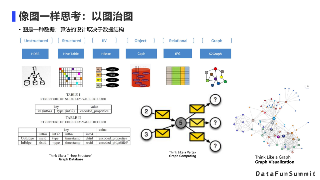 不同格式的数据需要的存储组件不同,HDFS存储非结构化数据,Hive存储有字段清晰的结构化数据。图既然也是一种特殊的数据结构,也需要高效的存储系统— —Graph Database。图数据库在存储图数据时充分考虑到数据查询遍历时的局部性问题,解决了一跳扩展甚至子图级的数据邻近存储。