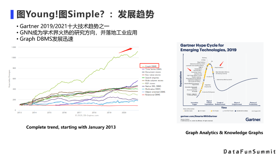 在2019和2021年Gartner数据和分析技术趋势预测中,都将图作为十大技术趋势之一(参考下图),工业界对图的应用以及学术界对图的研究也成为趋势,并在实际应用场景落地较多。而图数据库管理系统在DBEngine Ranking也扶摇直上,成为发展趋势最快的方向。