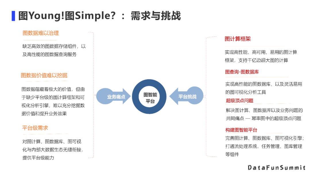从腾讯内部业务的需求和痛点进一步说明,腾讯在QQ、微信、广告、支付、游戏、视频、音乐等场景有着丰富多样的图数据,某些业务场景单个网络可达十亿级顶点、千亿级边,如此庞大的图数据蕴藏着价值,也给图的存储、计算、分析提出了更高的的要求,特别是超级顶点的存在成为存储和计算的的共同难题,也是亟需解决的问题。为了提升组件的易用性,需要和内部大数据生态打通,如TDW、HDFS、Spark、Flink、调度系统等,最终围绕图数据库、图计算框架、图可视化平台组件等构建图智能平台。