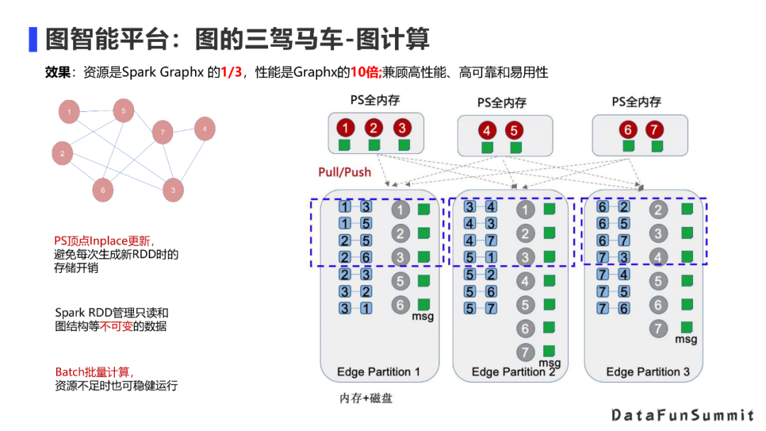 在实现图计算框架时首先考虑图的分布式切分问题。因为百亿级甚至千亿级的图,单机是难以存下的。目前Angel-Graph基于参数服务器的架构,将顶点信息存储在全内存的ps上,在图计算或图算法如PageRank的迭代计算过程中,边结构是不变的,数据的频繁更新发生在顶点上。Graphx低效的原因之一是RDD的immutable特性,RDD的每次更新需要生成新的RDD,因此占用了大量的内存开销。为了保障在受限共享资源环境下图计算任务的稳定运行,Angel-Graph引入了batch计算的逻辑,业务侧可以根据资源配置调整计算速度,保障资源不足的情况下仍能稳定运行。