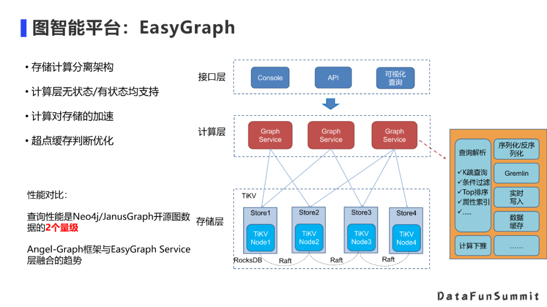 目前EasyGraph采用了存储计算分离架构,查询层既支持无状态的TP查询需求,也支持有状态的AP分析,比如刚才提到的3跳以上的查询计算问题,单点的server的计算性能较差,难以满足业务需求,因此可以采用分布式的server来解决。