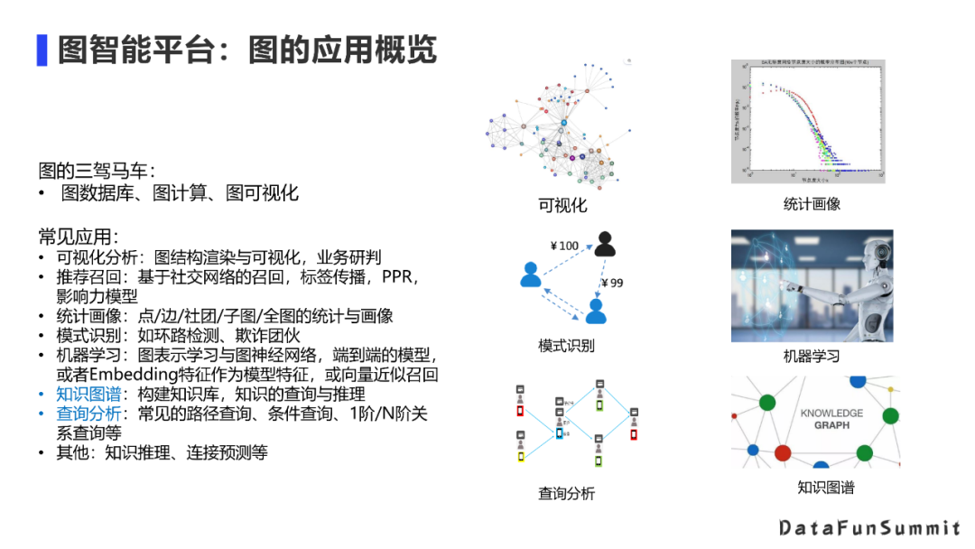 总结而言,图的普遍应用需求便是图智能平台需要解决的问题,技术层面可以归纳为存储、计算(离线、在线)、可视化以及易用的开发工具等。场景的应用如可视化分析、统计画像、模式识别、图学习、知识图谱、查询分析等。