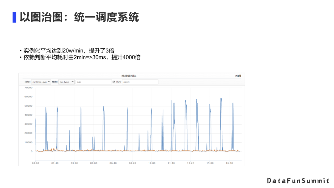 相比采用MySQL存储依赖关系的解决方案,图数据库使得之前两分钟轮训调度耗时下降到了30毫秒,整个调度实时性提升了4000倍,在没有用图数据库之前,我们看到在整点的时候这个波峰效应非常明显,采用图数据库后波峰效应大幅度降低,任务调度的实时性也得到了保障。