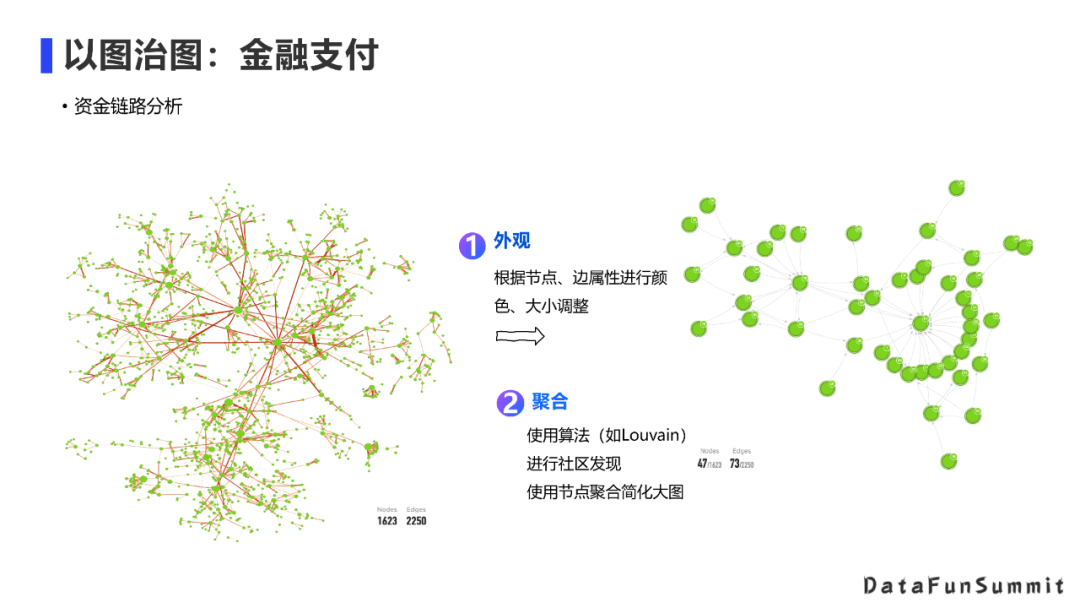 图可视化引擎可以应用在资金链路分析中。左图大概一千多个点,两千多条边,这是一个完整的图。为了更方便对局部信息可视化分析,我们做了很多优化,一方面能对点、边的属性进行颜色、大小的调整,另外也提供了一些聚合的算法,比如通过一些社区发现算法或者业务给定聚合规则对点或局部的子图进行聚合,聚合后图中顶点自然包含了很多统计信息。也可以点击展开分析某个聚合点,这样帮助用户清晰的判断局部交易情况。