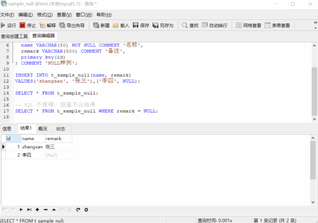 SELECT * FROM t_sample_null WHERE remark = NULL;