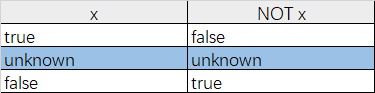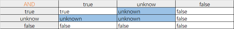 -- 7.如果 AND 运算里包含 unknown,则结果不为true(参考三值逻辑的逻辑值表)