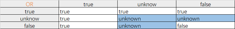 -- 3.unknown OR unknown 的结果是unknown (参考三值逻辑的逻辑值表)