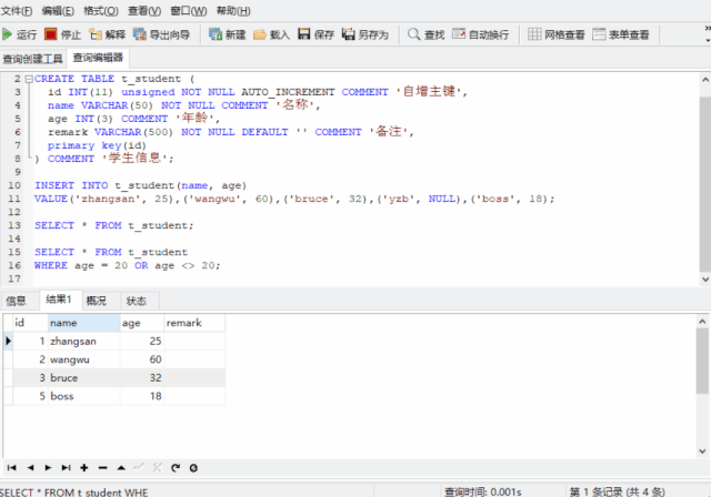 VALUE('zhangsan', 25),('wangwu', 60),('bruce', 32),('yzb', NULL),('boss', 18);
