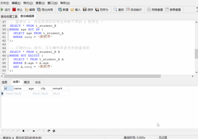 -- 查询与 A 班住在深圳的学生年龄不同的 B 班学生 ?