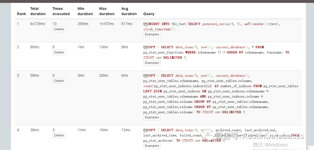 查询时间直方图,最慢的单个查询,耗时查询:规范化查询及其总持续时间的列表,最频繁查询:一列规范化查询和执行次数,归一化最慢查询:归一化查询及其平均持续时间的列表,等信息。