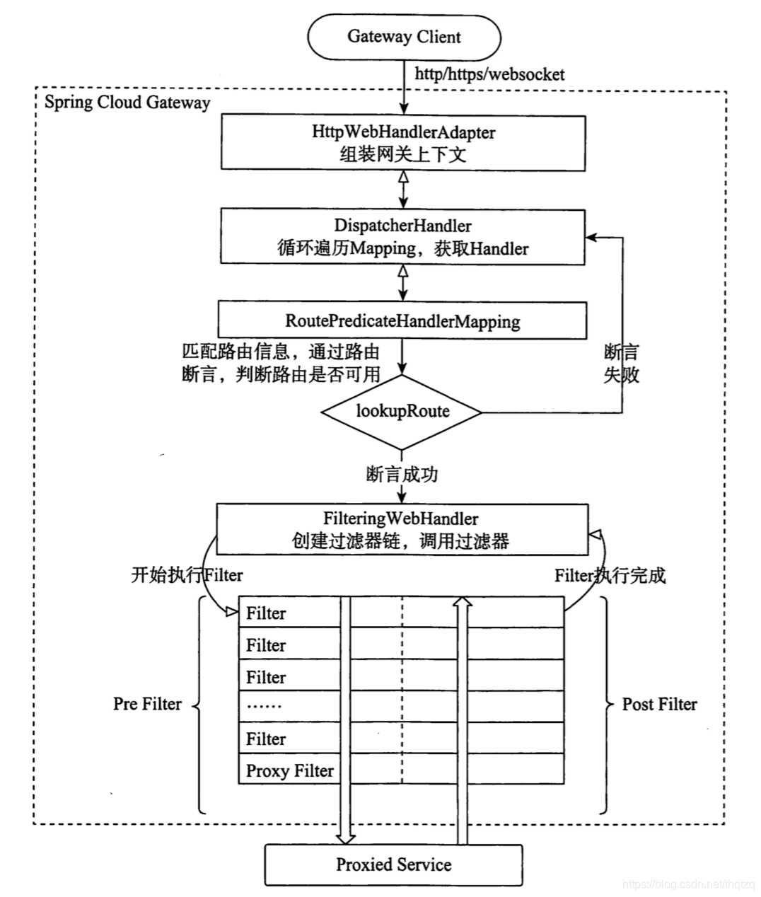 系统用户通过Gateway客户端向Spring Cloud Gateway发起服务调用请求,通过HttpWebHandleAdapter提取组装成网关上下文,将网关上下文DispatcherHandler;DispatcherHandler根据断言类型将请求分发给不同的断言处理器进行处理(上图分发给路由断言处理器);路由断言处理器负责根据URI与Gateway Path进行匹配,匹配成功返回对应的FilteringWebHandler;FilteringWebHandler主要负责组装过滤器链并进行一系列的过滤器链调用处理后,转发至具体的被调用服务实例,被调用服务实例处理完毕后,将处理结果返回至Gateway客户端。
