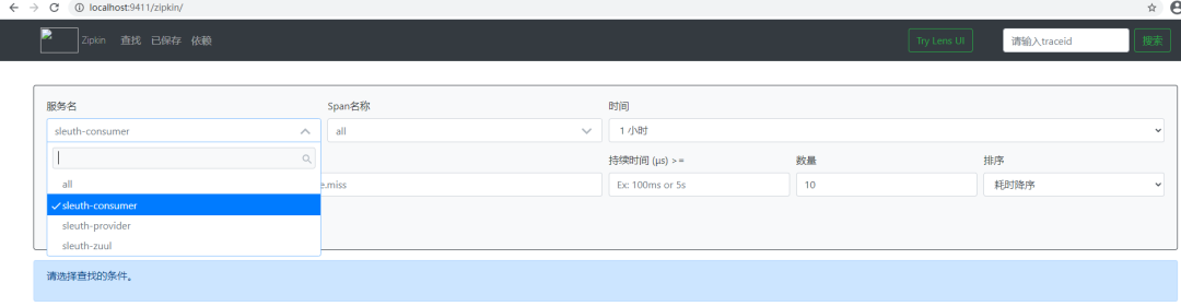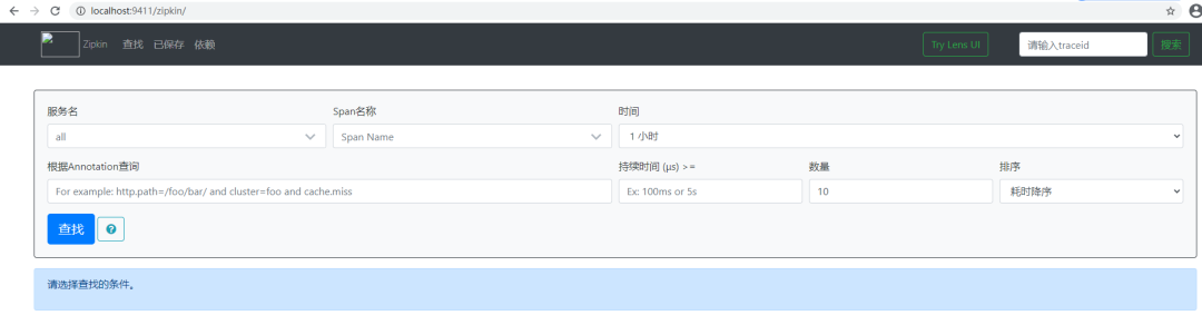 通过上述方式启动ZipkinServer,访问9411端口(zipkin配置文件默认应用端口),如下