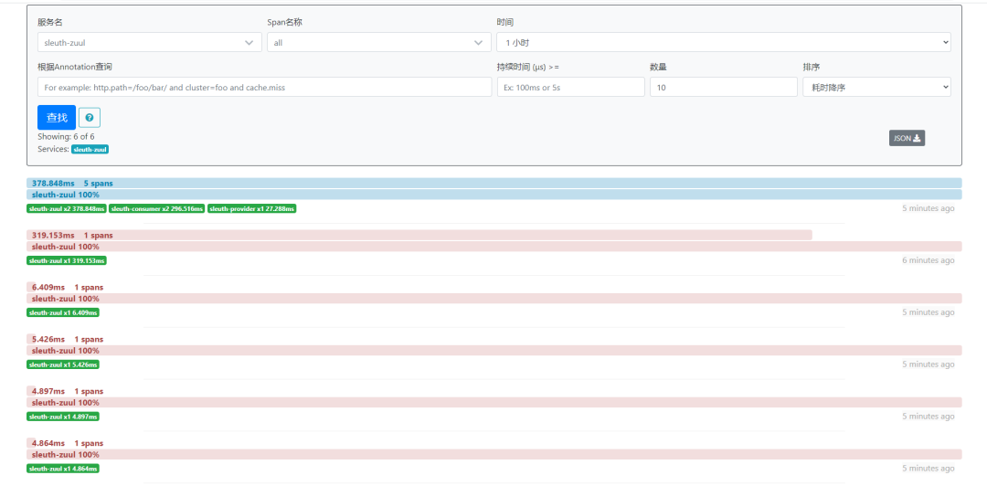 通过下图,可以看到通过服务网关发起了5次服务调用请求(Trace),每个服务调用请求可以看到调用链路耗时、多少个基本工作单元(Span)组成,经历了哪些服务的调用。