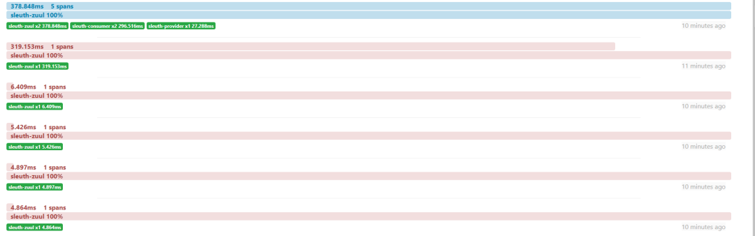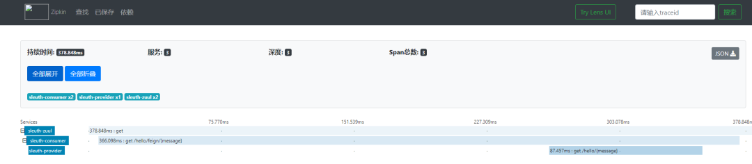 通过上图,看到服务提供者、服务消费者、服务网关均已注册至服务注册中心,此时选择服务网关应用(sleuth-zuul)点击查询可以查看服务调用结果。