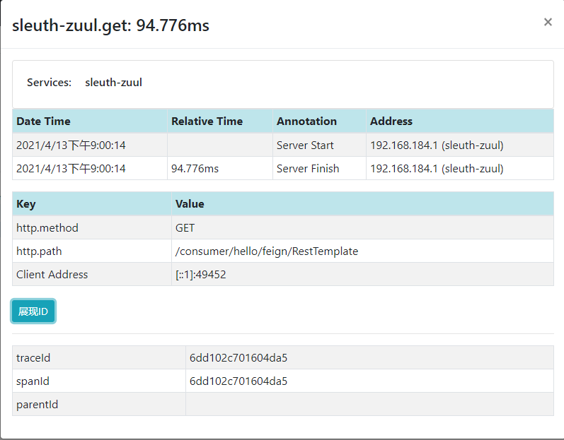 sr(Server Received):服务端(服务提供者)获得服务调用请求信息,并开始具体的服务调用处理。将sr减去cs得到的时间戳,就是具体的网络延迟时间。