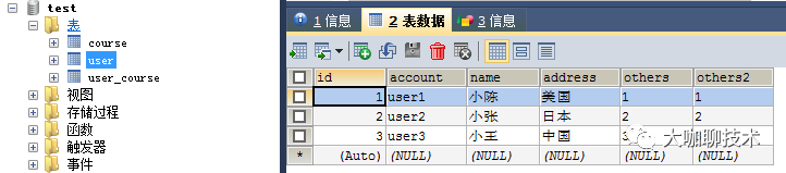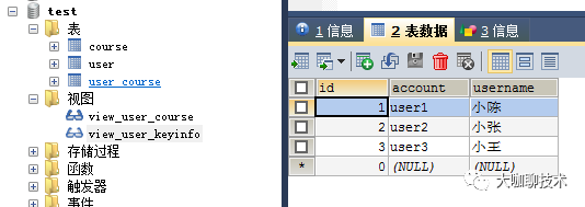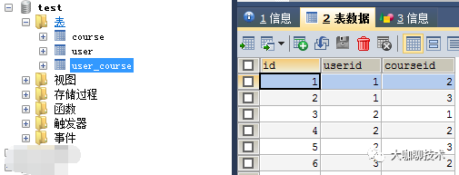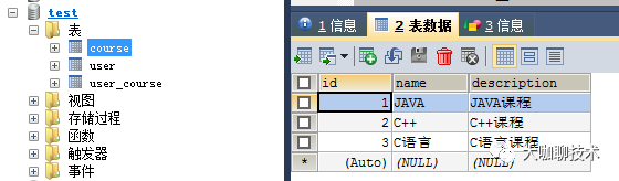 现有三张表:用户(user)、课程(course)、用户课程中间表(user_course),表结构及数据如下: