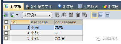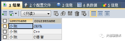 3:创建好视图之后,我们可以直接用以下SQL语句在视图上查询小张上的所以课程相关信息,同样可以得到所需结果: