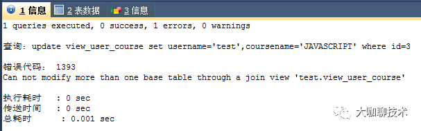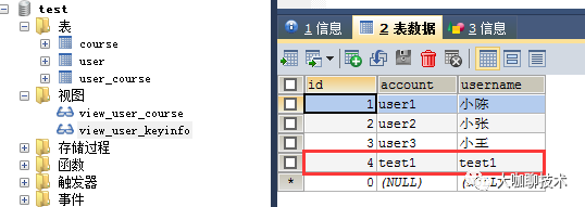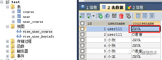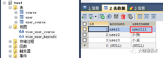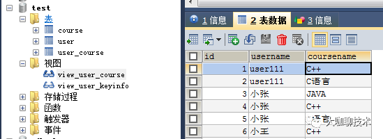 继续,我们可以尝试在视图view_user_course上做增删改数据操作,如下: