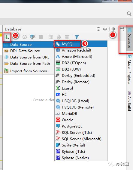 选择Database,点击“+”,选择Data Source,然后选择数据库类型即可: