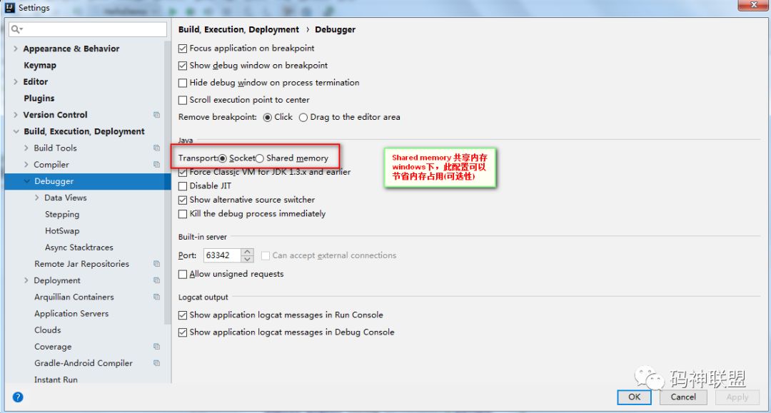 设置Debug连接方式,默认是Socket。Shared memory是Windows特有的一个属性,一般在Windows系统下建议使用此设置,内存占用相对较少