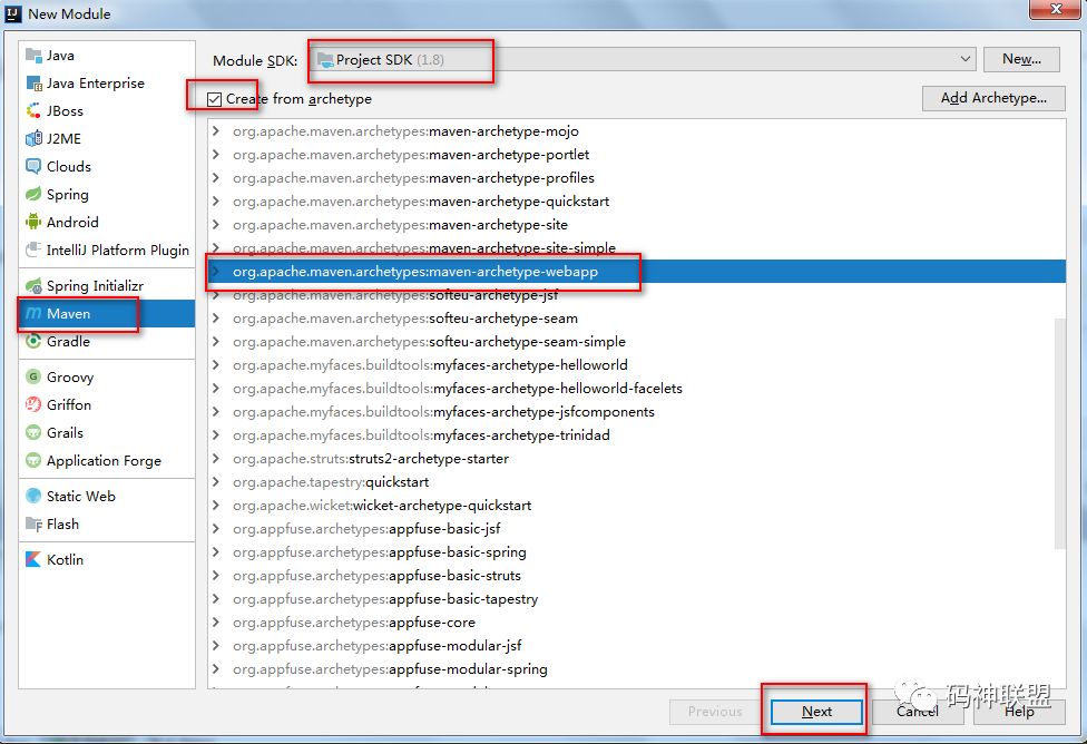 在弹出的窗口中选择Maven,选择对应的JDK版本,然后选中Create from archetype,选择webapp的选项,点击【Next】按钮