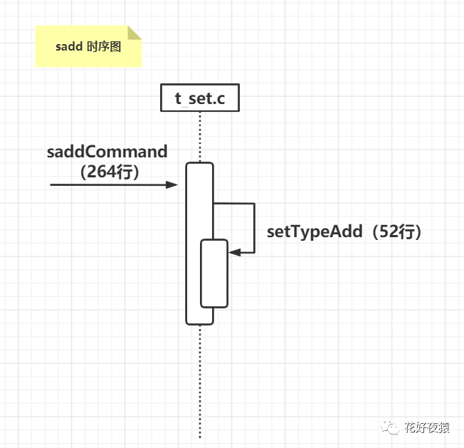 以 t_set.c 的文件作为入口文件,以 sadd 的增加命令作为命令行 API 入口进行分析追踪,下面是 sadd 处理的时序图