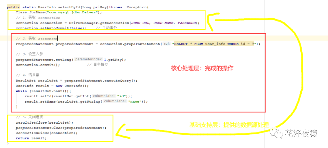 如上述 JDBC 原生 API 代码实现,执行 SQL 操作,需要如下几个步骤: