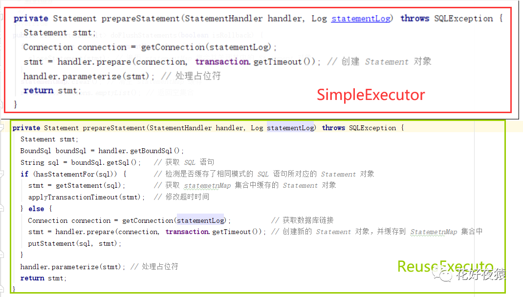 通过代码对比,能够知道两者进行 Statement 对象预处理的操作流程是一样的,不同点在于 ReuseExecutor