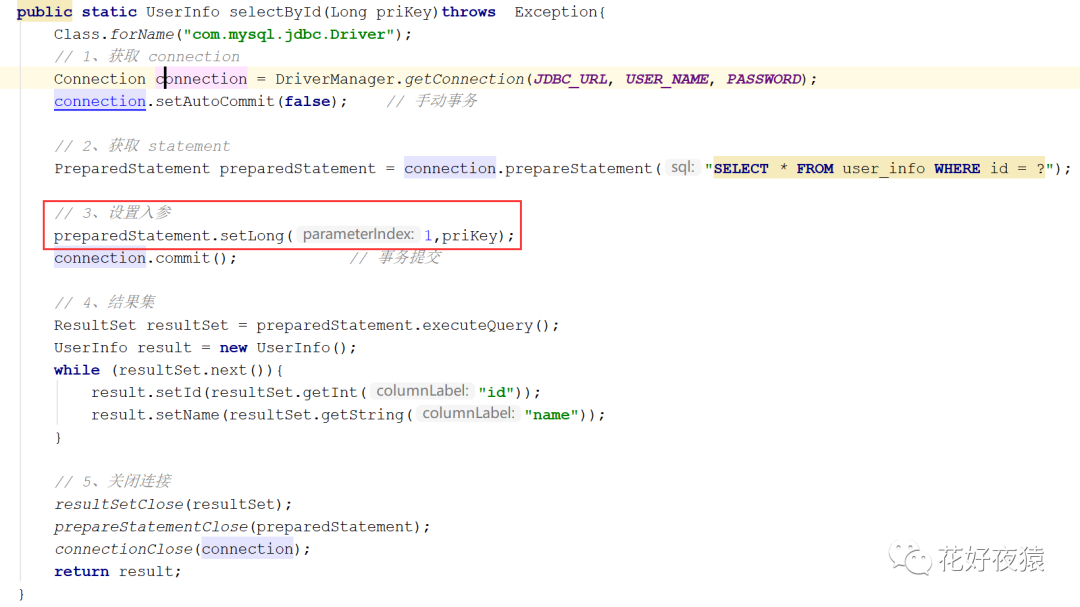 这边再来回顾一下 JDBC 原生 API 使用 PrepareStatement