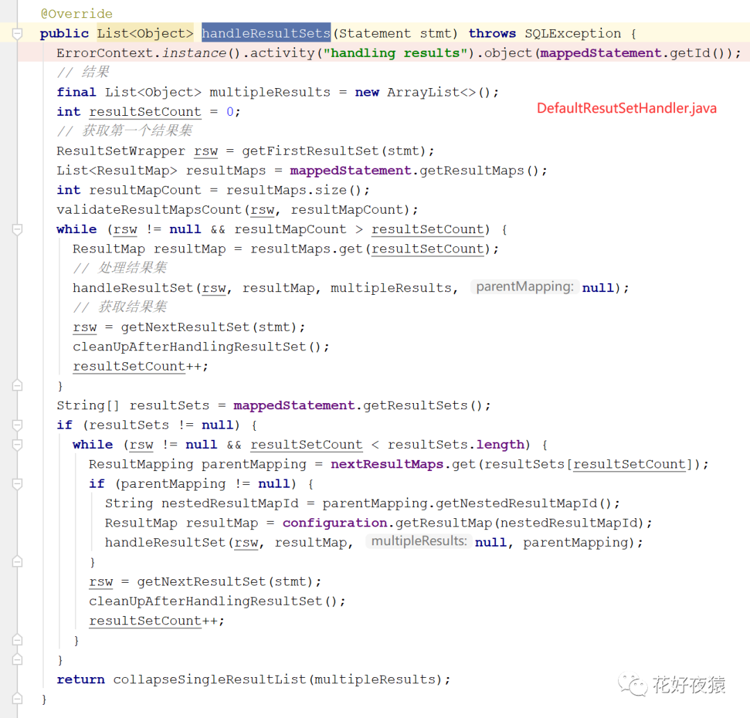这里以结果集处理进行展开。对应的是方法为 DefaultResultSetHandler#handleResultSets