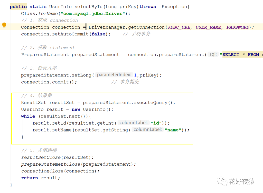 上述代码对应的 JDBC 原生API,如下图中步骤四,结果集的处理