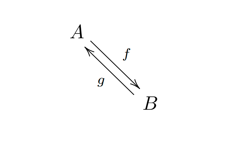 & B \ar@<.5ex>[ul]^g