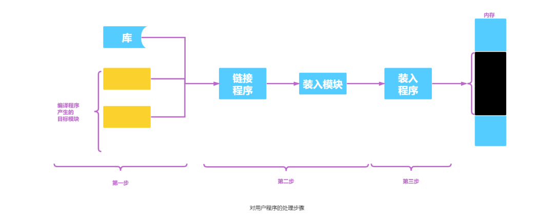 如下图所示,显示了由源程序转变为可在内存中执行的三步过程。