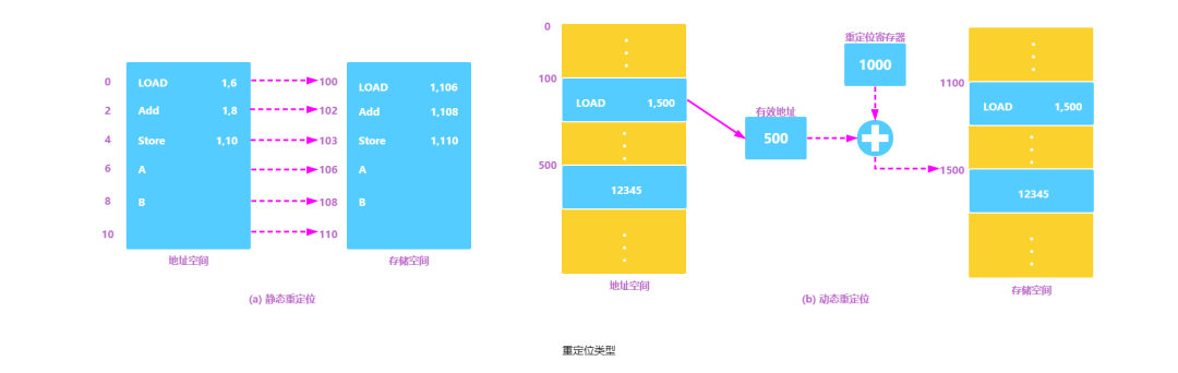 绝对装入。在编译时,若知道程序将驻留在内存的某个位置,则编译程序将产生物理地址的目标代码。绝对装入程序按照装入模块中的地址,将程序和数据装入内存。由于程序中的逻辑地址与实际内存地址完全相同,故不需对程序和数据的地址进行修改。绝对装入方式只适用于单道程序环境。另外,程序中所用的物理地址,可在编译或汇编时给出,也可由程序员直接赋予。而通常情况下在程序中采用的是符号地址,编译或汇编时再转换为物理地址。 可重定位装入。在多道程序环境下,用户程序编译所形成的若干个目标模块的起始地址通常都从 0 开始,程序中的其他地址都是相对于起始地址计算的,此时应采用可重定位装入方式。根据内存的当前情况,将装入模块装入内存的适当位置。装入时对目标程序中指令和数据地址的修改过程称为重定位,地址变换通常是在装入时一次完成的,以后不再改变,故称为静态重定位,如下图(a)所示。静态重定位的特点是,一个作业装入内存时,必须给它分配要求的全部内存空间,若没有足够足够的内存,则不能装入该作业。此外,作业一旦进入内存,整个运行期间就不能在内存中移动,也不能在申请内存空间。 动态运行时装入,也称动态重定位。程序在运行过程中,它在内存中若发生移动,则需要采用动态的装入方式。装入程序把装入模块装入内存中,并不立即把装入模块中的逻辑地址转换为物理地址,而是把这种地址转换推迟到程序真正要执行时才进行。因此,装入内存后的所有地址仍是逻辑地址。为使地址转换不影响指令的执行速度,需要一个重定位寄存器的支持。如下图(b) 所示。动态重定位的特点是,可以将程序分配到不连续的存储区中,在程序运行之前可以只装入它的部分代码即可投入运行,然后在程序运行期间,根据需要动态申请分配内存;便于程序段的共享,可以向用户提供一个比存储空间大得多的地址空间。