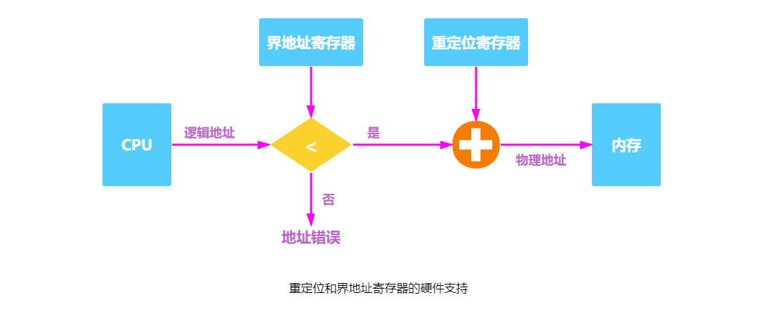 在 CPU 中设置一对上、下限寄存器,存放用户作业在主存中的下限和上限地址,每当 CPU 要访问一个地址时,分别和两个寄存器的值相比,判断有无越界。 采用重定位寄存器(或基址寄存器)和界地址寄存器(又称限长寄存器)来实现这种保护。重定位寄存器含最小的物理地址值,界地址寄存器含逻辑地址的最大值。每个逻辑地址值必须小于界地址寄存器;内存管理机构动态地将逻辑地址与界地址寄存器进行比较,若未发生地址越界,则加上重定位寄存器的值后映射成物理地址,再送交内存单元,如下图所示。