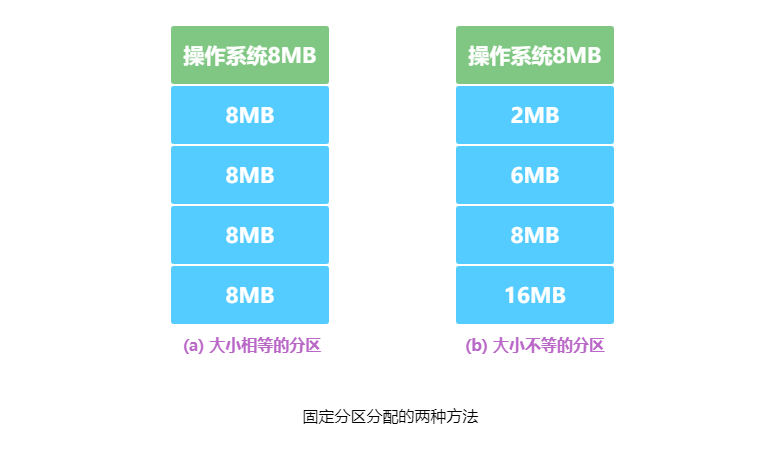 固定分区分配在划分分区时有两种不同的方式,如下所示。