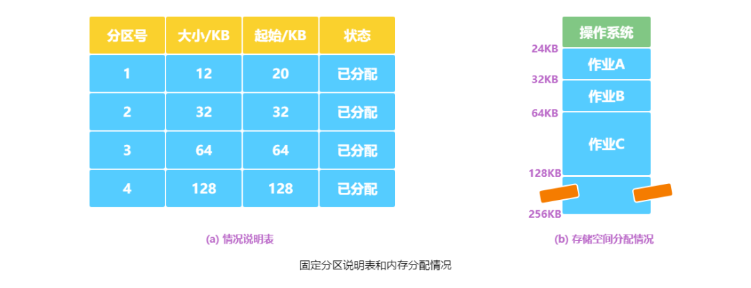 为便于内存分配,通常将分区按大小排队,并为之建立一张分区说明表,其中各表项包括每个分区的始址、大小以及状态是否已分配,如下图 (a) 所示。当有用户程序要装入时,便检索该表,以找到合适的分区给予分配并将其状态置为 “已分配”;未找到合适分区时,则拒绝为该用户程序分配内存。存储空间分配情况如下图 (b) 所示。