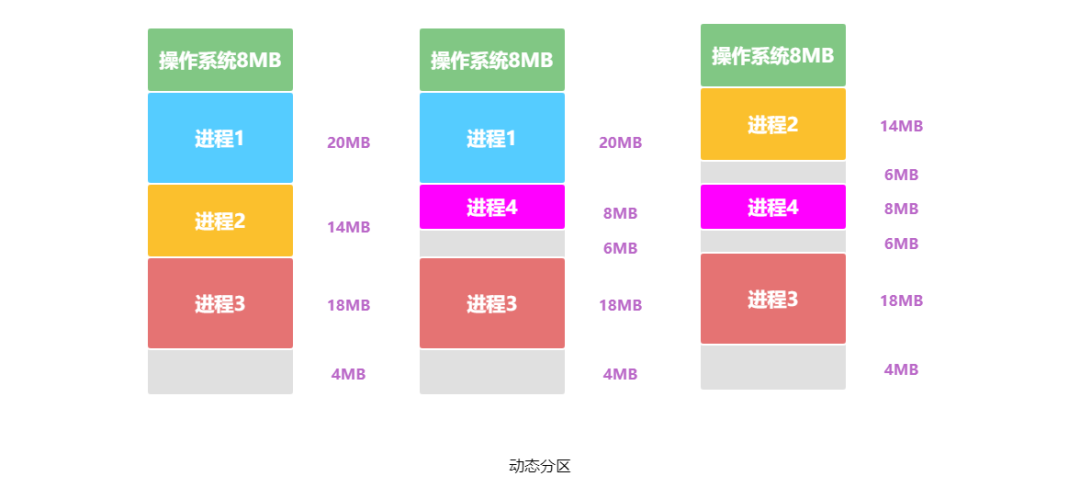 如下图所示,系统有 64MB 内存空间,其中低 8MB 固定分配给操作系统,其余为用户可用内存。开始时装入前三个进程,它们分别分配到所需的空间后,内存只剩下 4MB,进程 4 无法装入。在某个时刻,内存中没有一个就绪进程,CPU 出现空闲,操作系统就换出进程 2,换入进程 4。由于进程 4 比进程 2 小,这样在主存中就产生了一个 6MB 的内存块。之后 CPU 又出现空闲,而主存无法容纳进程 2,操作系统就换出进程 1,换入进程 2。