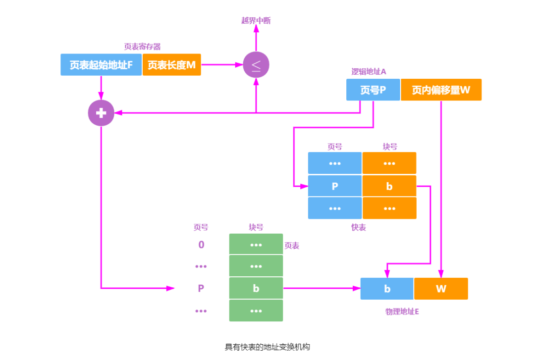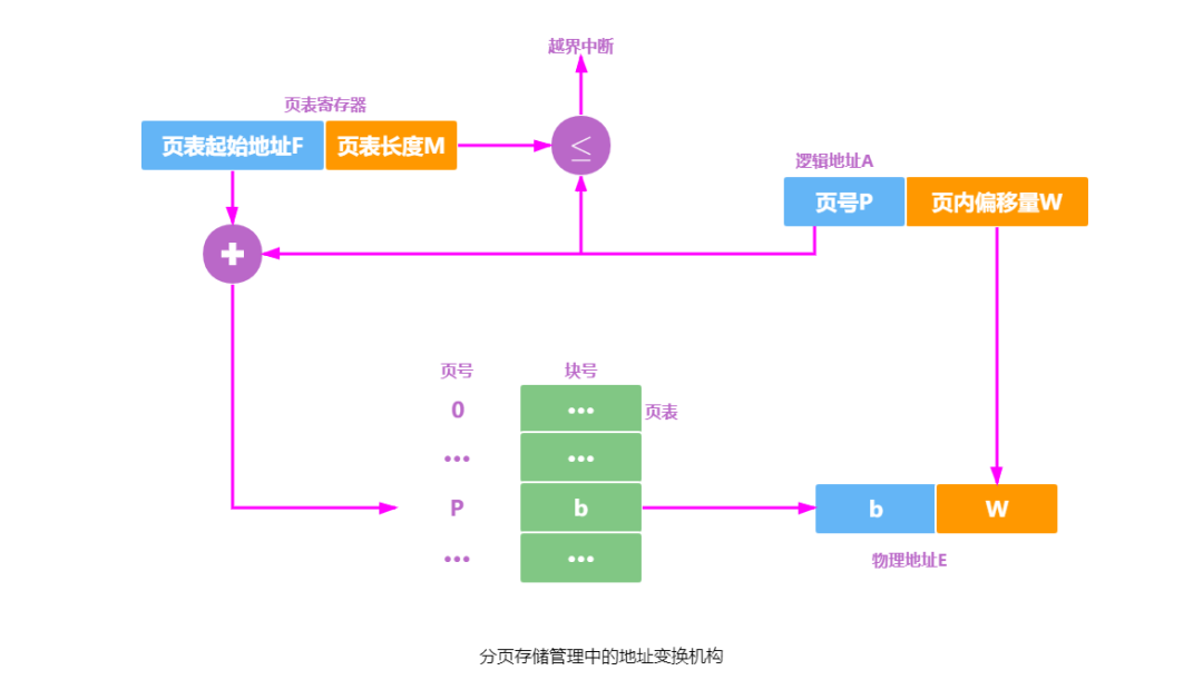 计算页号 P(P = A/L)和页内偏移量 W(W = A%L)。 比较页号 P 和页表长度 M,若 ,则产生越界中断,否则继续执行。 页表中页号 P 对应的页表项地址 = 页表始址 F + 页号 P x 页表项长度,取出该页表项内容 b,即为物理块号。 计算 E = b x L + W,用得到的物理地址 E 去访问内存。