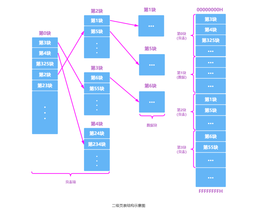二级页表实际上是在原有页表结构上再加上一层页表,示意结构如下图所示。