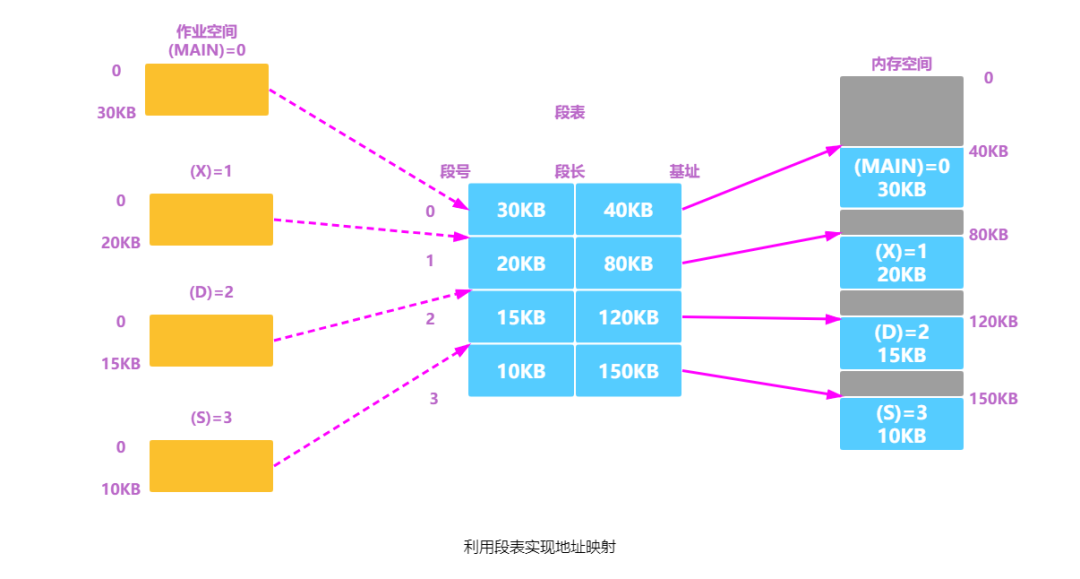 配置段表后,执行中的进程可通过查找段表,找到每段所对应的内存区。可见,段表是用于实现从逻辑段到物理内存区的映射的,如下图所示。