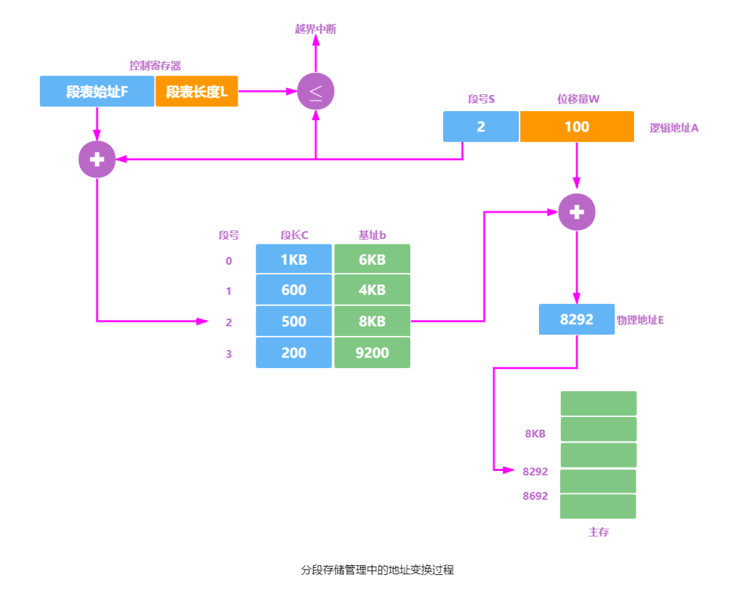 从逻辑地址 A 中得到段号 S 和段内地址 W。 比较逻辑地址中的段号 S 和段表长度 L,若 ,访问越界,产生越界中断,否则继续执行。 根据段表的始址 F 和该段的段号 S,计算出该段对应的段表项的段长 C = F + S x 段表项长度,比较段表项的长度 C 与段内地址 W,若 ,则产生越界中断,否则继续执行。 取出段表项中该段的始址 b,计算 E = b + W,用得到的物理地址 E 去访问目标内存单元。