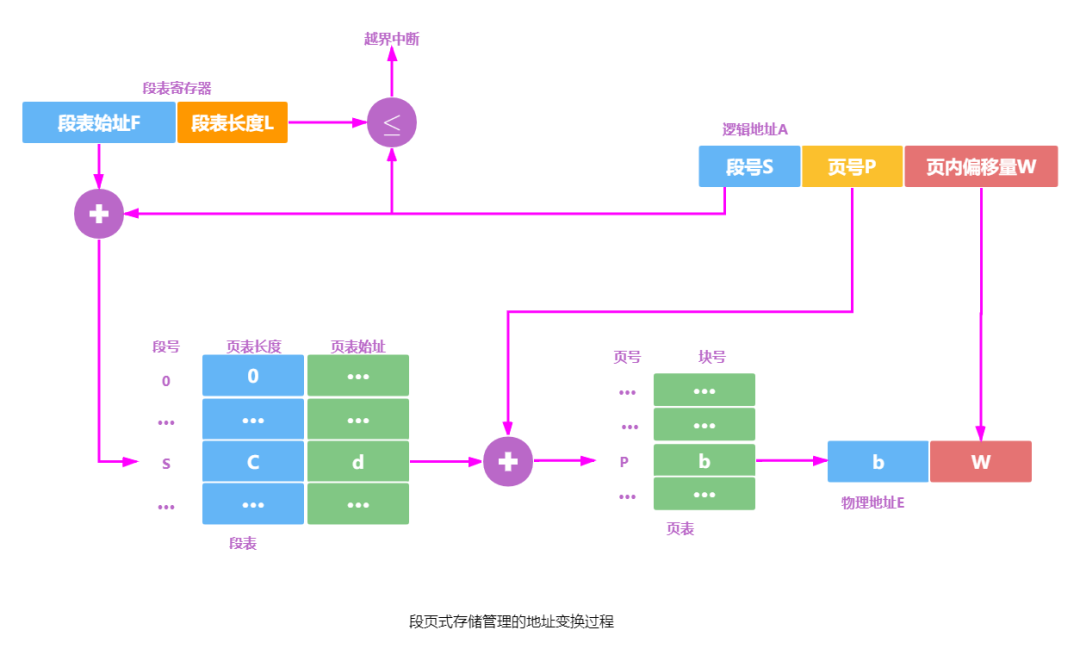 根据逻辑地址得到段号 S、页号 P、页内偏移量 W。 利用段号 S 与段长 L 比较,若 ,则产生越界中断,否则继续执行。 根据段表始址 F 和该段的段号 S,计算出段表项的存放地址 D = F + S x 段表项长度,从中得到该段的页表始址 SP,比较页表始址 SP 与页表长度 PL,若 ,则发生越界中断,否则继续执行。 根据逻辑地址中的段内页号 SP 获得对应页表项位置,从中读出该页所在的物理块号 b。 根据物理块号 b、页内变异量得到最终的物理地址并访问目标内存单元。