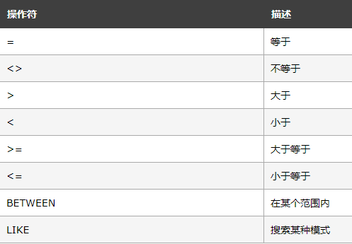 1):在某些版本的 SQL 中,操作符 <> 可以写为 !=。我们在例子中的条件值周围使用的是单引号。SQL 使用单引号来环绕文本值(大部分数据库系统也接受双引号)。如果是数值,请不要使用引号。