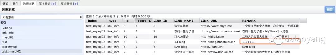 数据都存在,然后修改id为5的数据,查看go-mysql-elasticsearch控制台,果然监听到了变化,如图