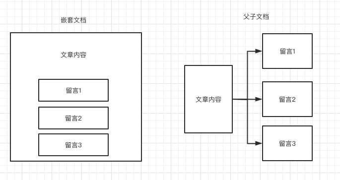 父子文档与嵌套文档主要的区别在于,父子文档的父对象和子对象都是独立的文档,而嵌套文档中都在同一个文档中存储,如下图所示: