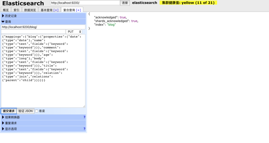 创建索引名和type均为blog的索引,从上面数据可以看出,其实父文档(博客内容)与子文档分别用不同的字段来存储对应的数据,不过在创建索引文档的时候需要指定父子文档的关系,即文章为parent,留言为child,创建索引语句如下: