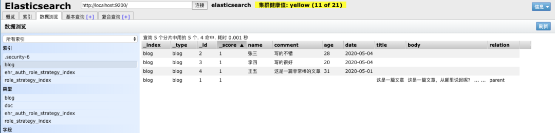 由于只有一组父子文档,效果不是很明显,感兴趣可以多造一些数据去体验