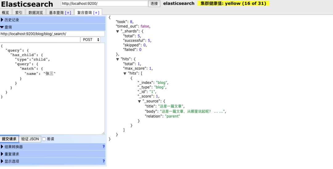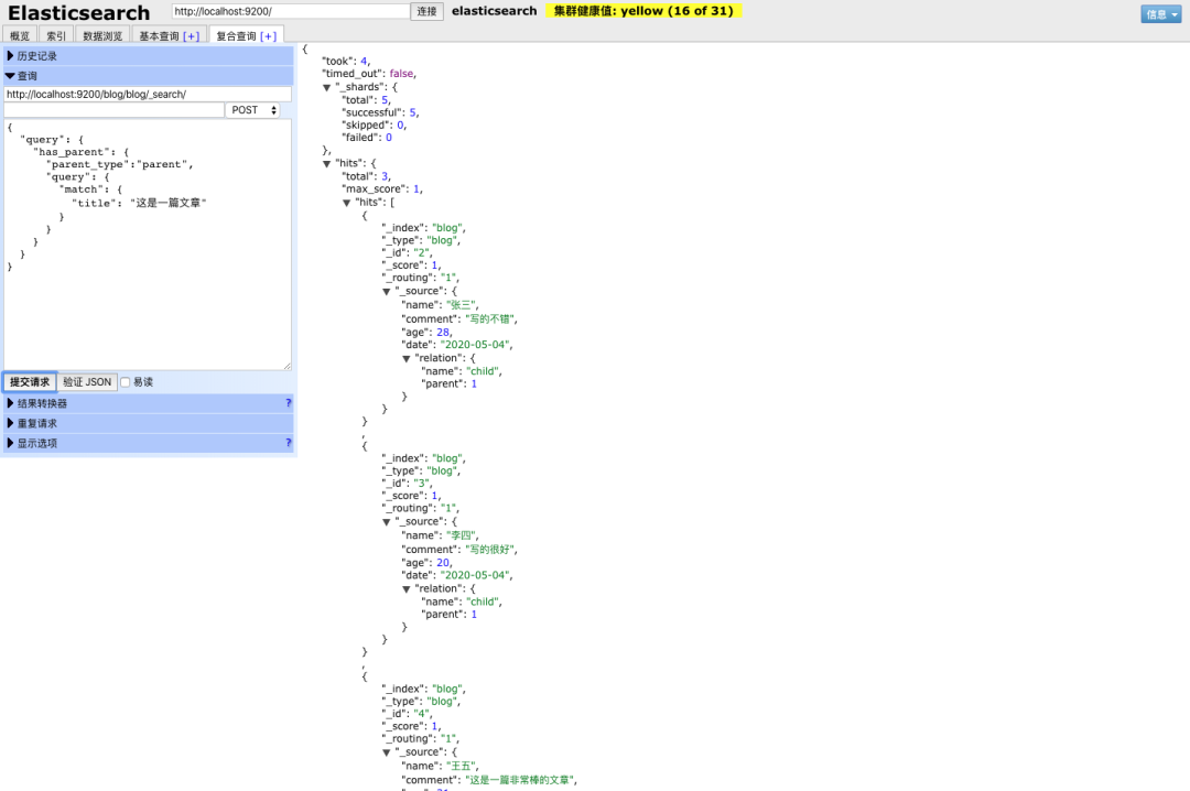 到这里,其实对Elasticsearch特性了解的读者就会知道如何根据父文档查询子文档了,只需要注意一点,父查子type需要修改成parent_type,其余都与自查父类似,比如查询标题为“这是一篇文章”的数据的留言内容,查询语句如下: