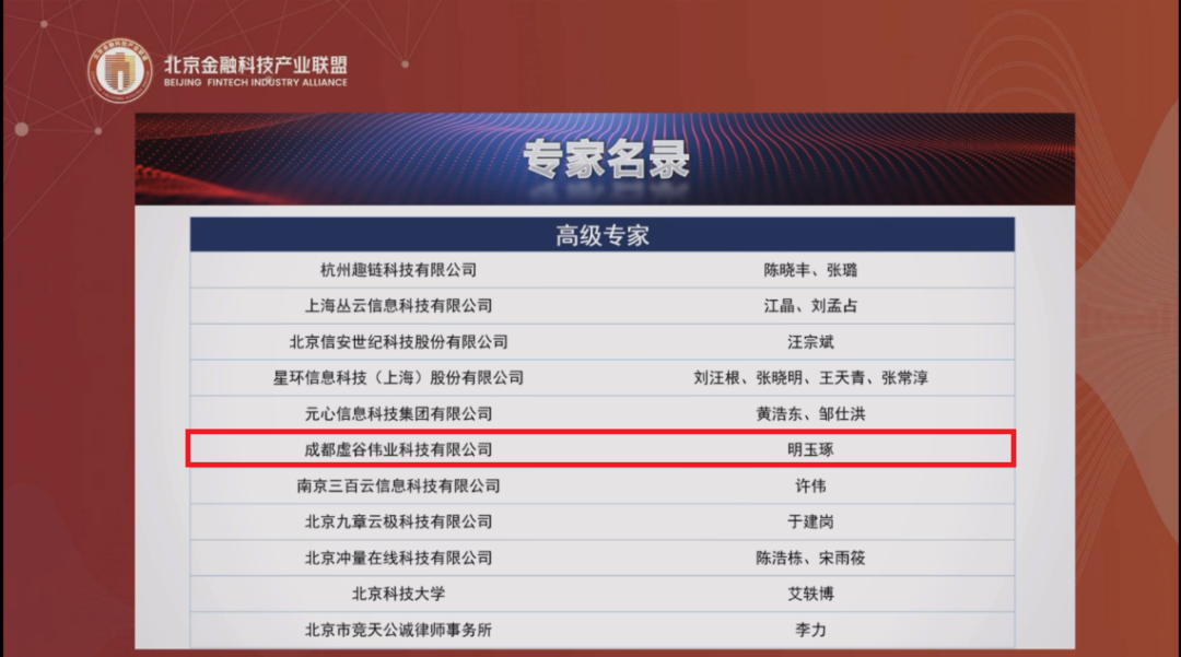大会中联盟专家库名单发布,成都虚谷伟业科技有限公司产品总监明玉琢被聘任为高级专家。